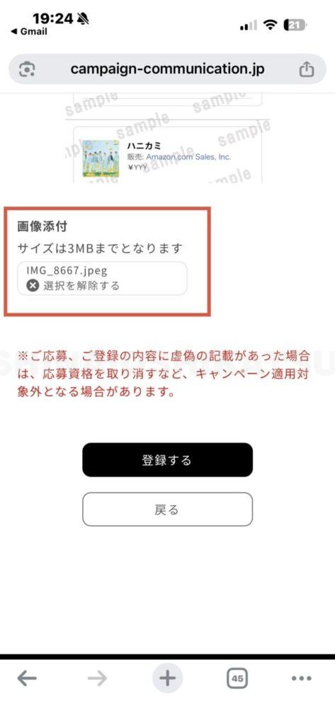 「ファイルを選択」ボタンをタップして、先ほど撮影したスクリーンショット画像をアップロードします。